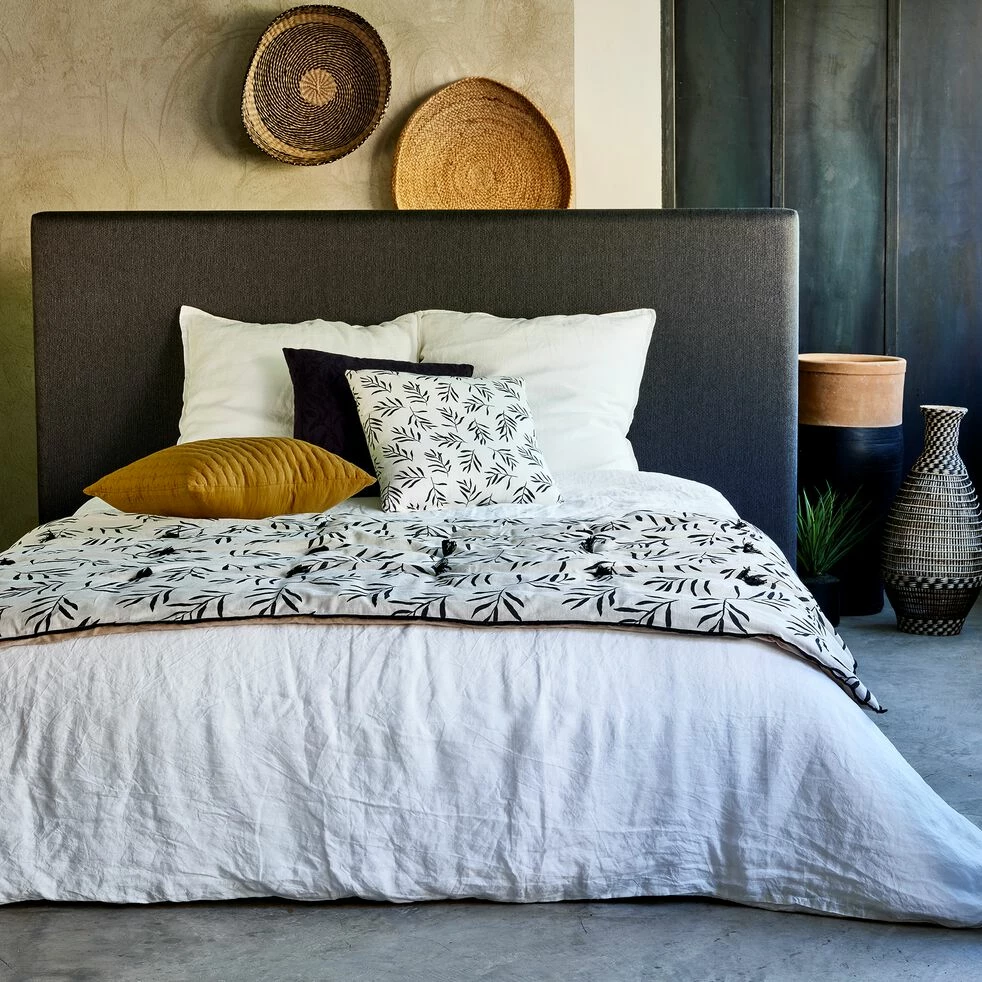 L’édredon Aloyse, d’un blanc écru lumineux, est un accessoire de choix pour coin nuit agréable. Tissé en coton et lin, cet édredon apportera du caractère à votre lit ainsi qu’un peu de chaleur au cours des nuits fraiches. Invitation à la paresse, il arbore de fines branches d’aloyse citronnée, comme peintes dans une fine aquarelle noire. Quelques pompons noirs viennent rythmer le motif et apporter de la légèreté à cette parure de lit. Plante emblématique du Liban, l’aloyse vous invite au voyage puis au repos, dans un décor éthéré où le bien-être règne en maître.