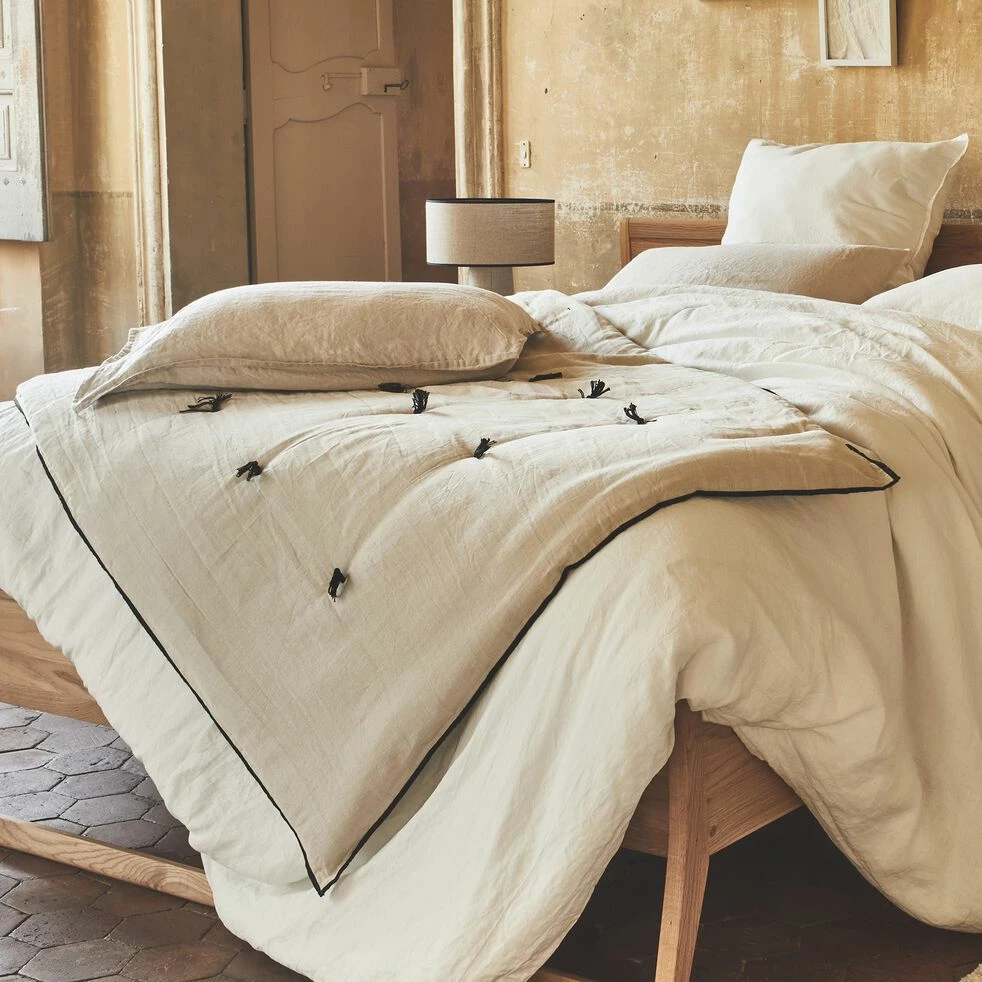 L’édredon Elina, d’un blanc écru naturel et lumineux, est un accessoire incontournable lorsque l’on souhaite se créer un coin douillet. Tissé en coton et lin, cet édredon apportera à la fois une touche déco à votre lit ainsi qu’un peu de chaleur durant les nuits d’hiver. Moelleux et confortable, cet édredon dispose d’un gonflant inimitable grâce à ses 5cm d’épaisseur. Invitation à la paresse, sa robe blanche arbore des détails en passepoil noirs : une garniture en relief située sur les bordures pour souligner les traits de l’édredon. Ce fin liseré est accompagné de quelques pompons noirs pour une touche fantaisiste et bohème qui apporte contraste et caractère à cet édredon blanc.