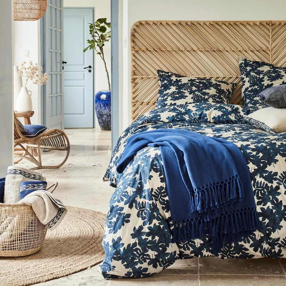 Cette housse de couette 240×220 cm et ses deux taies d’oreiller sont parfaites pour habiller votre lit 2 places. Ses motifs feuilles de figuiers et sa couleur bleutĂ©e rappellent les cĂ´tes grecques d’oĂą on peut apercevoir les vagues de la mer Ă©gĂ©e. ComposĂ©e de coton 57 fils, cette housse de couette est particulièrement douce et lĂ©gère, mais elle est aussi rĂ©sistante. Sa finition droite avec boutons cachĂ©s et ses taies d’oreiller avec double surpiqĂ»re offrent une impression soignĂ©e et nette. Associez votre housse de couette avec des coussins dĂ©coratifs aux plusieurs teintes de bleu afin d’obtenir une chambre au charme mĂ©diterranĂ©en reprĂ©sentative de ce motif inspirĂ© du charme de la mer Ă©gĂ©e.